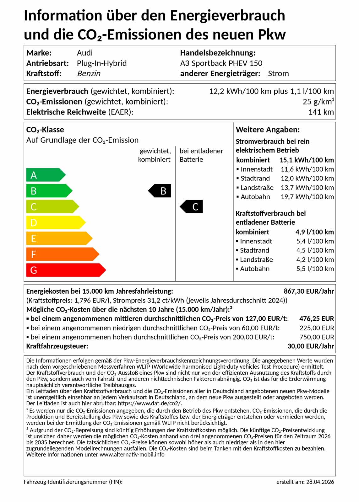 Kraftstoffverbrauch (gewichtet kombiniert): 1,1 l/100 km; Energieverbrauch (gewichtet kombiniert): 12,2 kWh/100 km; CO2-Emissionen (gewichtet kombiniert): 25 g/km; Kraftstoffverbrauch bei entladener Batterie (kombiniert): 4,9 l/100 km; CO2-Klasse (gewichtet kombiniert): B; CO2-Klasse bei entladener Batterie (kombiniert): C. Fahrzeugabbildung kann vom Angebot abweichen.