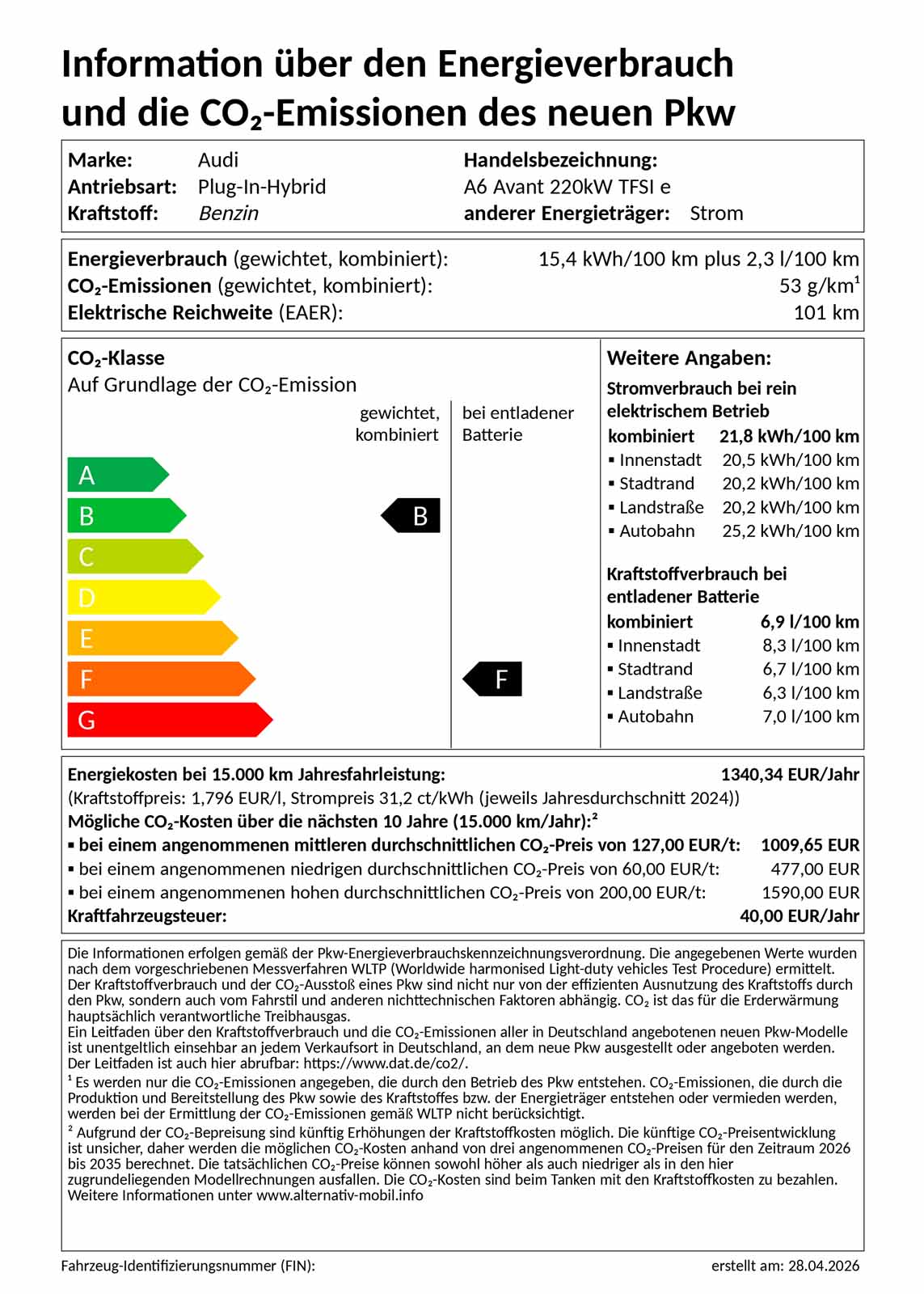Kraftstoffverbrauch (gewichtet kombiniert): 2,3 l/100 km; Energieverbrauch (gewichtet kombiniert): 15,4 kWh/100 km; CO2-Emissionen (gewichtet kombiniert): 53 g/km; Kraftstoffverbrauch bei entladener Batterie (kombiniert): 6,9 l/100 km; CO2-Klasse (gewichtet kombiniert): B; CO2-Klasse bei entladener Batterie (kombiniert): F. Fahrzeugabbildung kann vom Angebot abweichen.