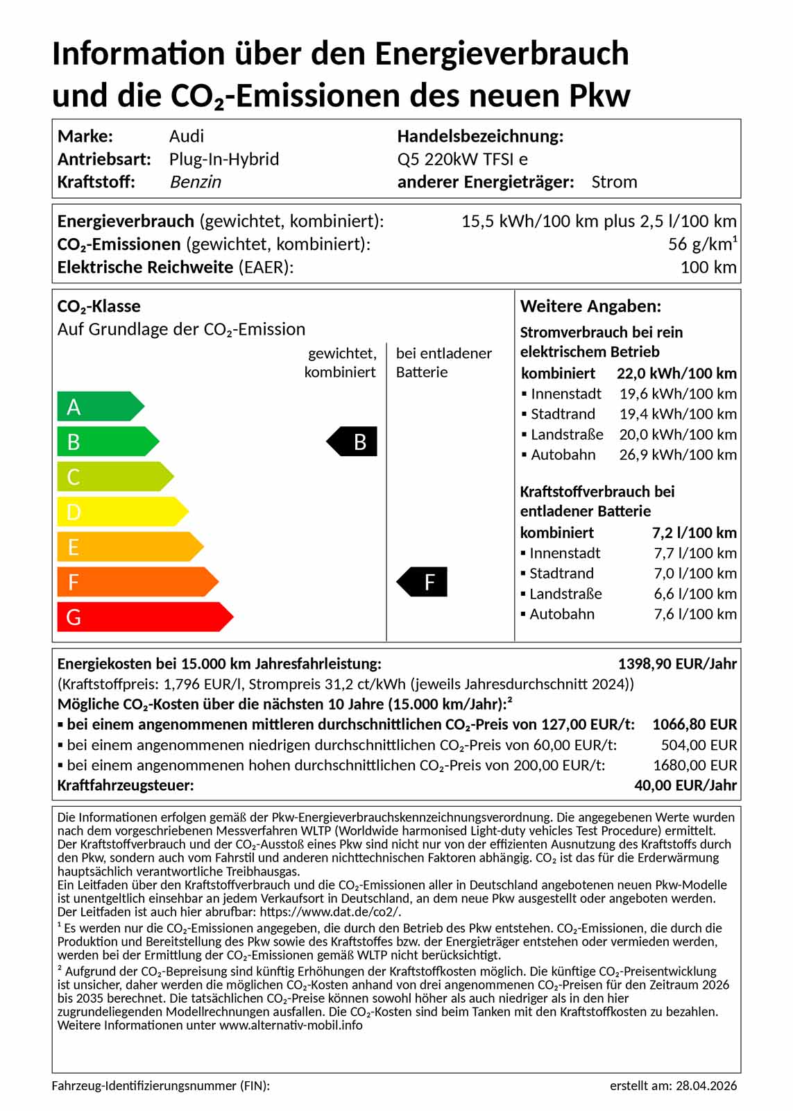 Kraftstoffverbrauch (gewichtet kombiniert): 2,5 l/100 km; Energieverbrauch (gewichtet kombiniert): 15,5 kWh/100 km; CO2-Emissionen (gewichtet kombiniert): 56 g/km; Kraftstoffverbrauch bei entladener Batterie (kombiniert): 7,2 l/100 km; CO2-Klasse (gewichtet kombiniert): B; CO2-Klasse bei entladener Batterie (kombiniert): F. Fahrzeugabbildung kann vom Angebot abweichen.