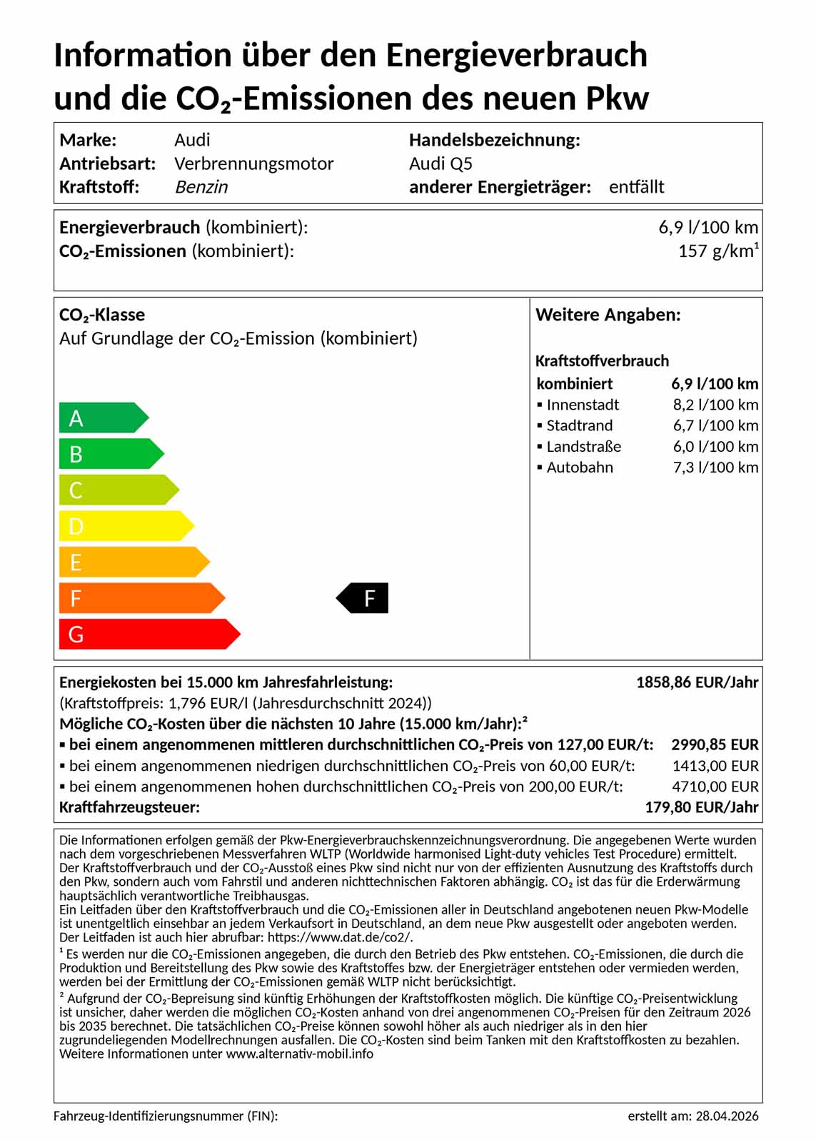 Kraftstoffverbrauch (kombiniert): 6,9 l/100 km; CO2-Emissionen (kombiniert): 157 g/km; CO2-Klasse: F. Fahrzeugabbildung kann vom Angebot abweichen.
